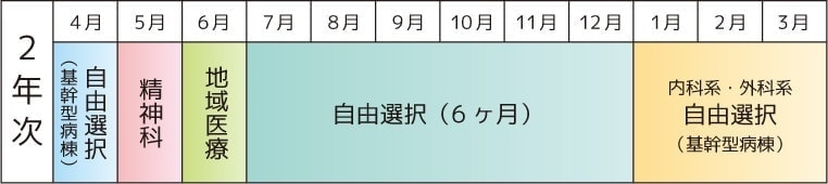 - 必修科目(精神科を除く)については、基本的に木戸病院で研修を開始・実施しますが、必要に応じて各協力病院と協同・協力のもとに実施します。なお、2年次8月以降の自由選択においては、研修する病院・施設も各自選択することができます。